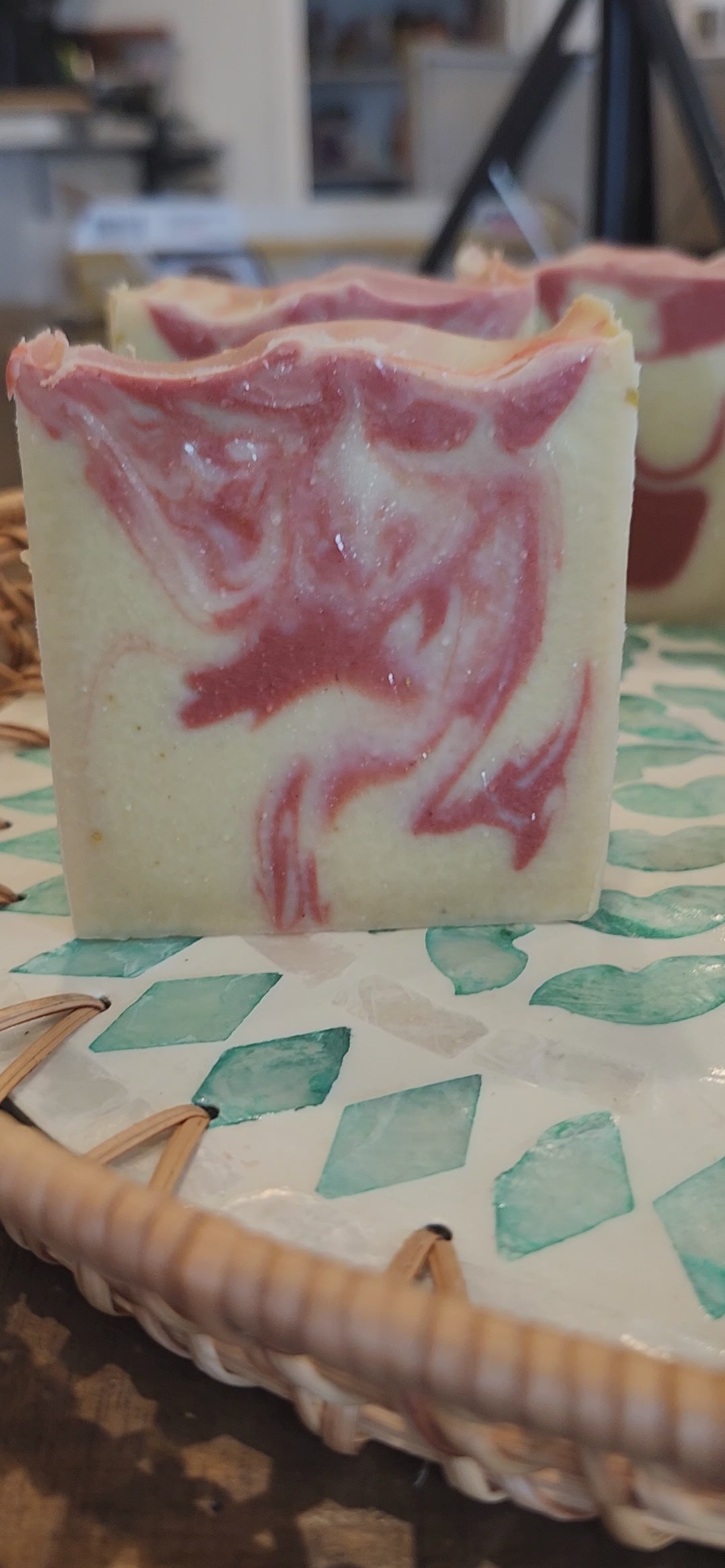 Ingredients: Luxurious blend of saponified olive oil, coconut oil, coconut milk, shea butter, mango seed butter, castor and sweet almond oil, fragrance oil, white kaolin clay, colloidal oats, mica